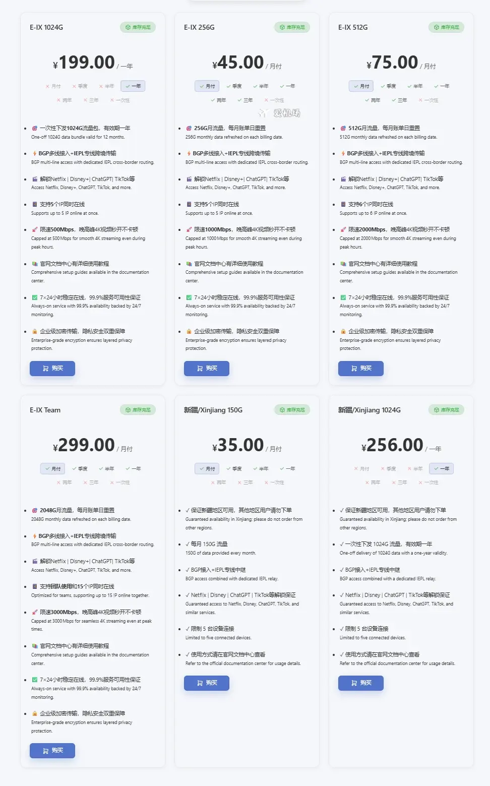 E-IX One Year 套餐为年付 ¥199,包含 1024G 一年流量,非每月重置,注意别搞错了,这个套餐适合轻量用户或作为备用梯子选项。