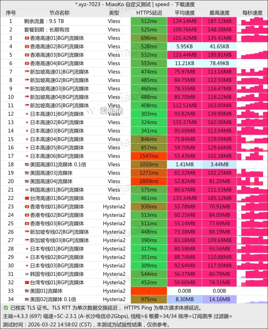 可以看到非晚高峰时段,也有多个节点的峰值速度能跑起来。不指望稳定性的前提下,还是能用的,适合可断点续传类型的大流量下载需求。