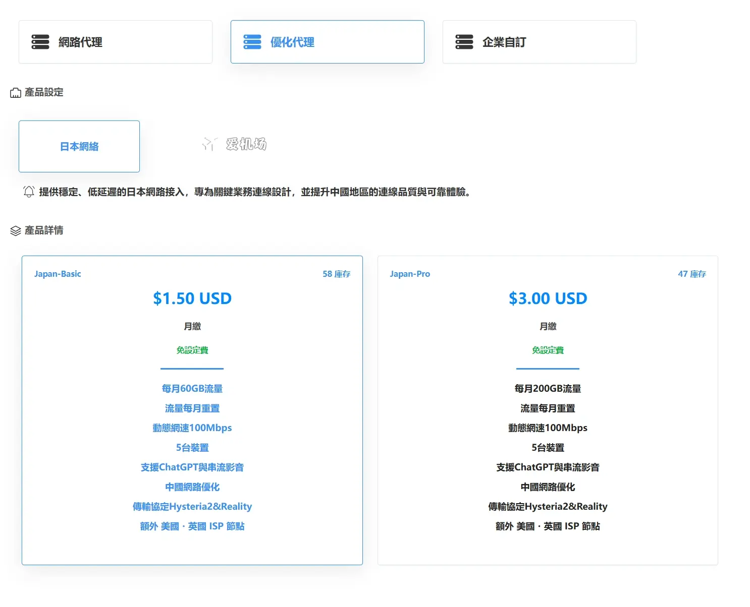 2026 新增的日本优化代理套餐,主打的是日本优化节点,也有区别于普通套餐的额外美国、英国节点,套餐总数在 40 个左右,跟常规套餐一样的双协议支持。