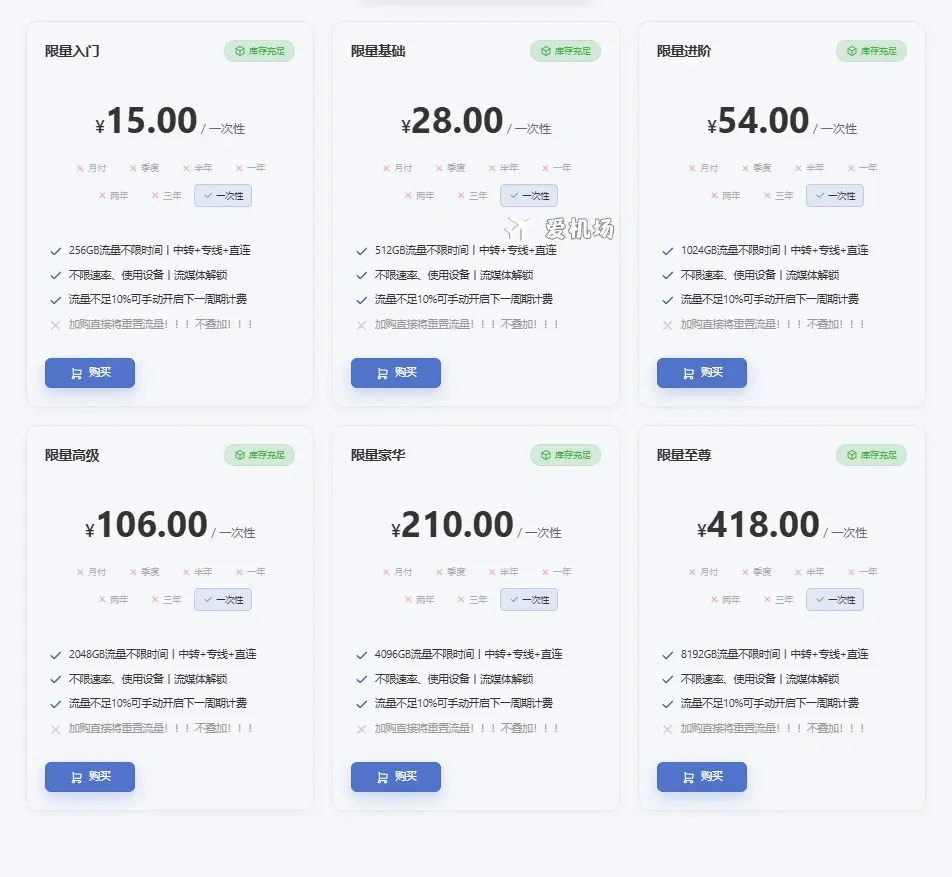 支持月付,套餐设置简单,月付套餐最低 ¥6/月起,限时迷你套餐,不包含专线节点。其他套餐都是全节点,年付有一定幅度优惠,同时有按量付费流量包提供。