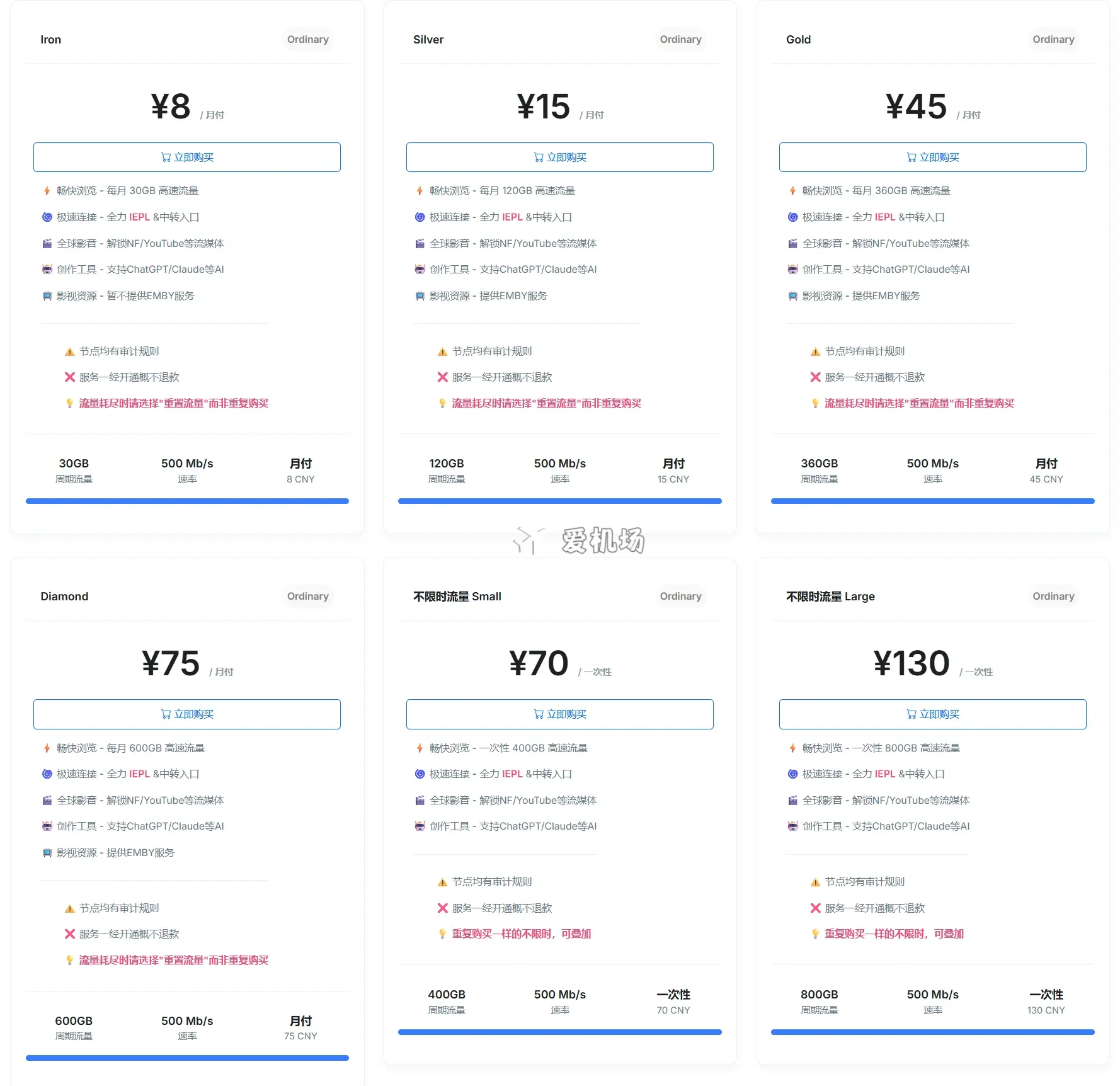 机场支持月付,同时有包月套餐和不限时长按量付费套餐。线路升级后,套餐价格暂时没有上涨,大概率后期 11 月将会涨价,欲购从速就对了。11月15日已完成调价,最新价格如下: