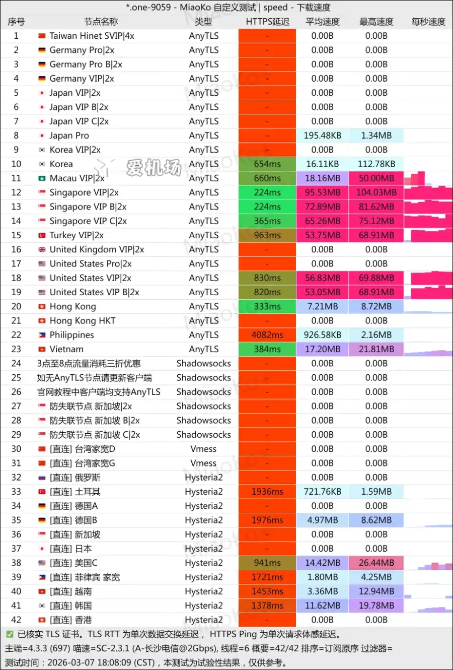 协议目前换到了以 AnyTLS 为主的中转节点且多为高倍率,也有 Shadowsocks、Vmess 和 Hysteria 2 的直连节点。
